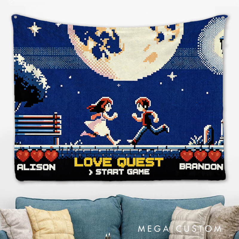 Personalized the Moon Couple Tapestry Pixel Art Video Game Tapestry Gift for Nerdy Wedding & Gaming Room Decor for Couples