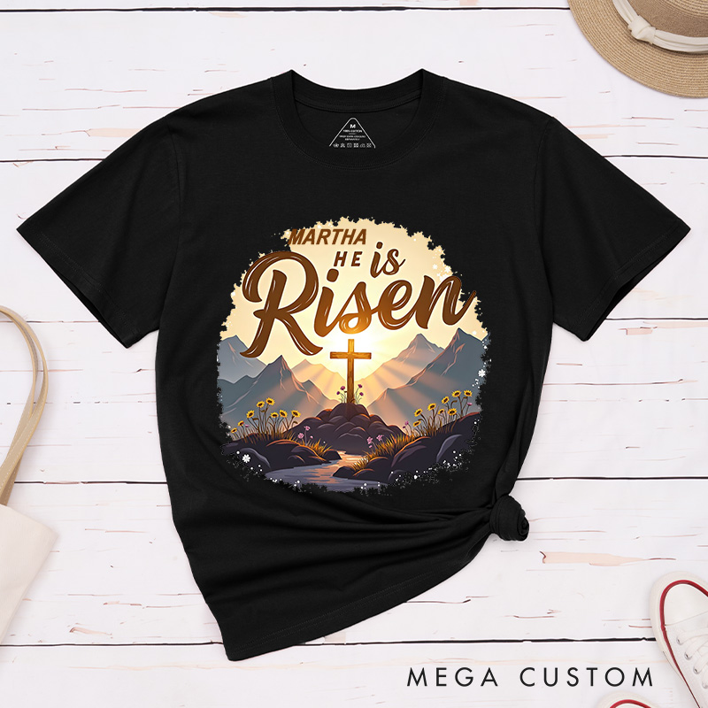 Personalized He is Risen Glory Classic T-Shirt with Name Radiant Resurrection Cross in Mountain Christian Cotton T-Shirt Christian Gift Easter Gift