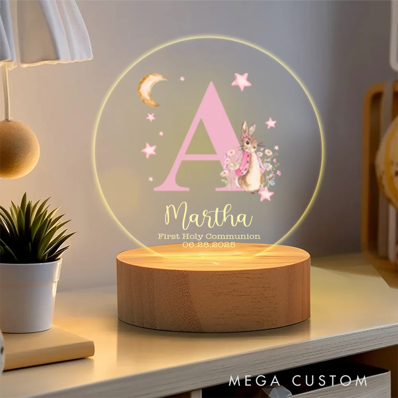 Personalized Rainbow Initial Floral Rabbit LED Night Light with Wooden Base and Name Date Nursery Decor First Holy Communion Easter Gift for Kid