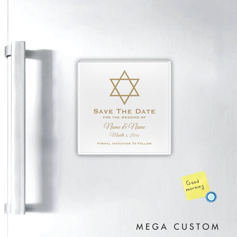 Star of David personalized Save the Date wedding magnet in white with gold lettering. Text is fully customizable.