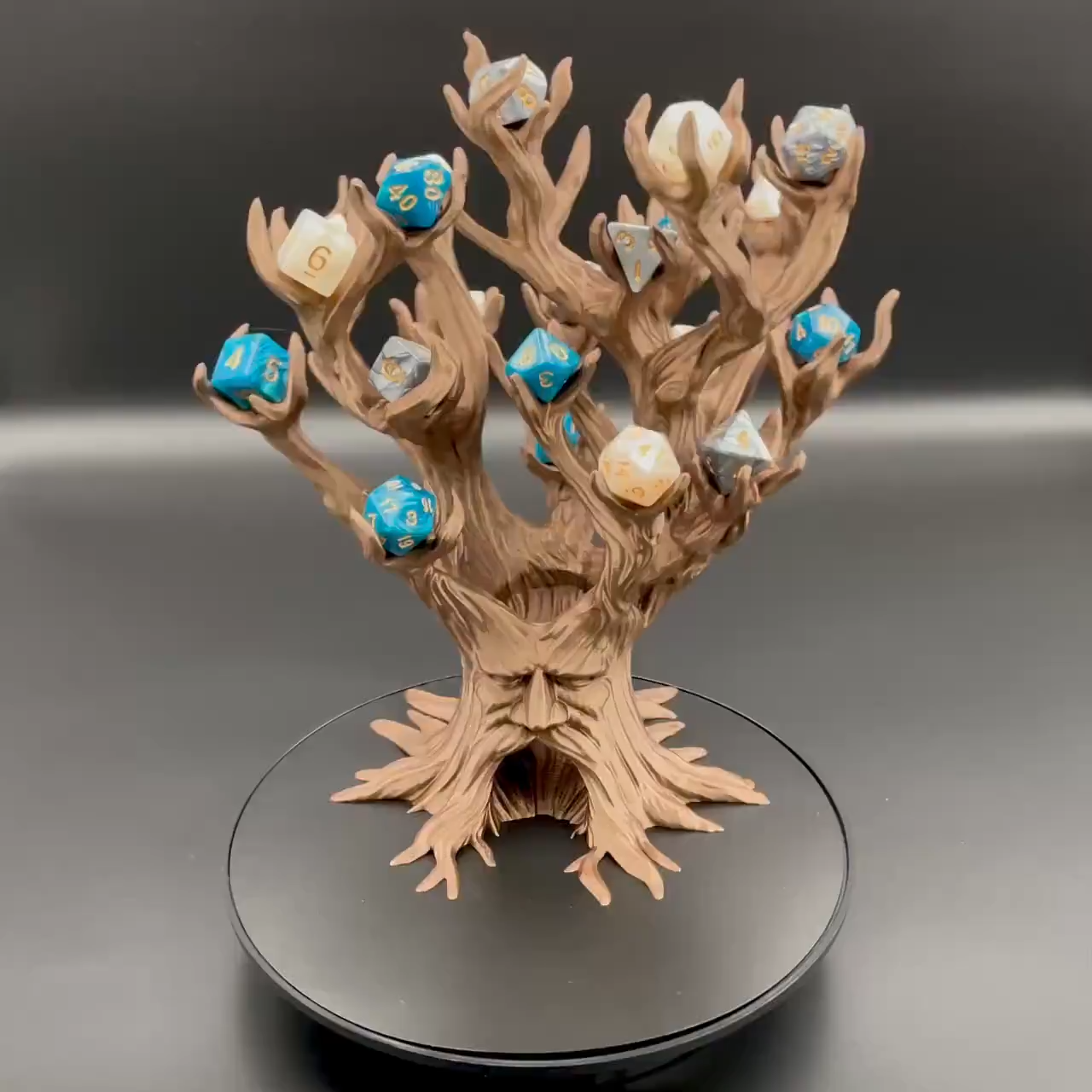 This creative tree-shaped dice organizer showcases the charm of fantasy with its unique design and exquisite details. The lifelike trunk seems to come from a magical forest, while the base incorporates human face elements, adding a touch of mystery. Each branch can be used to hold dice, making it convenient for storage and showcasing your beloved collection. Made of high-quality materials, it is sturdy and durable, with exquisite details, making it an ideal choice for board game enthusiasts. Whether used for board game parties, role-playing games, or as home decoration, this dice organizer will become an eye-catching focal point and is also a perfect gift for gamers or fantasy lovers.