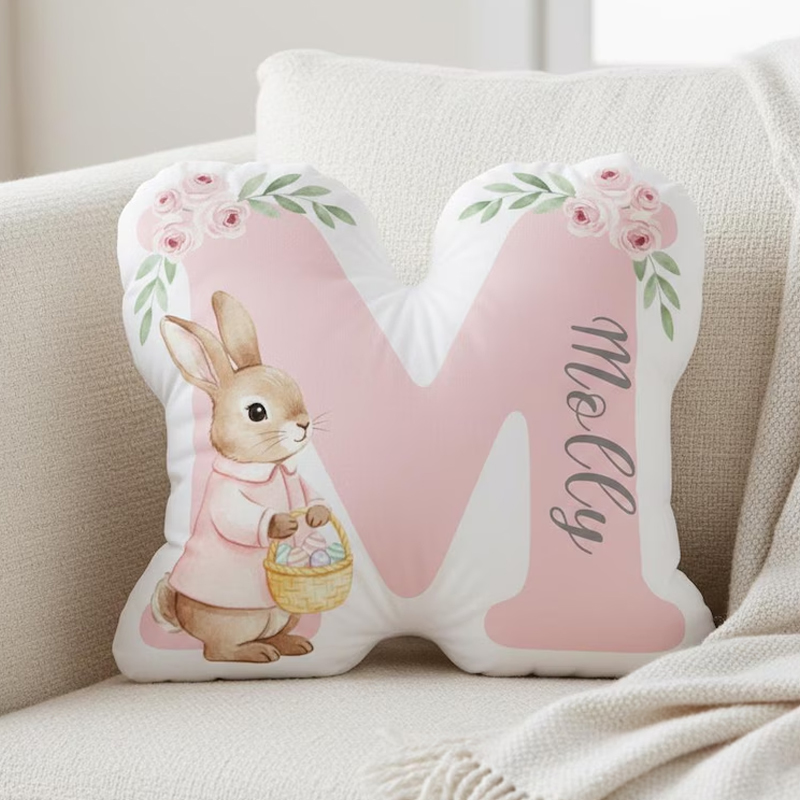 Personalized Easter Bunny Floral Alphabet Custom Name Soft Cushion Spring Decor Gift for Kids Room Nursery Decoration Graphic 3D Print Pillow