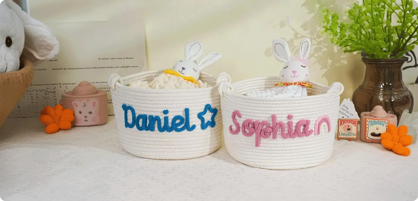 The hunt isn’t complete without baskets to collect the eggs. Personalized Easter baskets not only look adorable but also make great keepsakes. Here are some ideas: