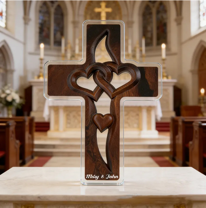 This personalized acrylic plaque is a beautiful symbol of faith, love, and unity. Expertly crafted with intricate heart-shaped carvings intertwined within the cross, it represents the bond of love and devotion. The cross acrylic plaque can be customized with names, making it a perfect gift for weddings, anniversaries, or any special occasion that celebrates love and commitment. It is a meaningful keepsake for couples or families, serving as a timeless reminder of faith and togetherness.