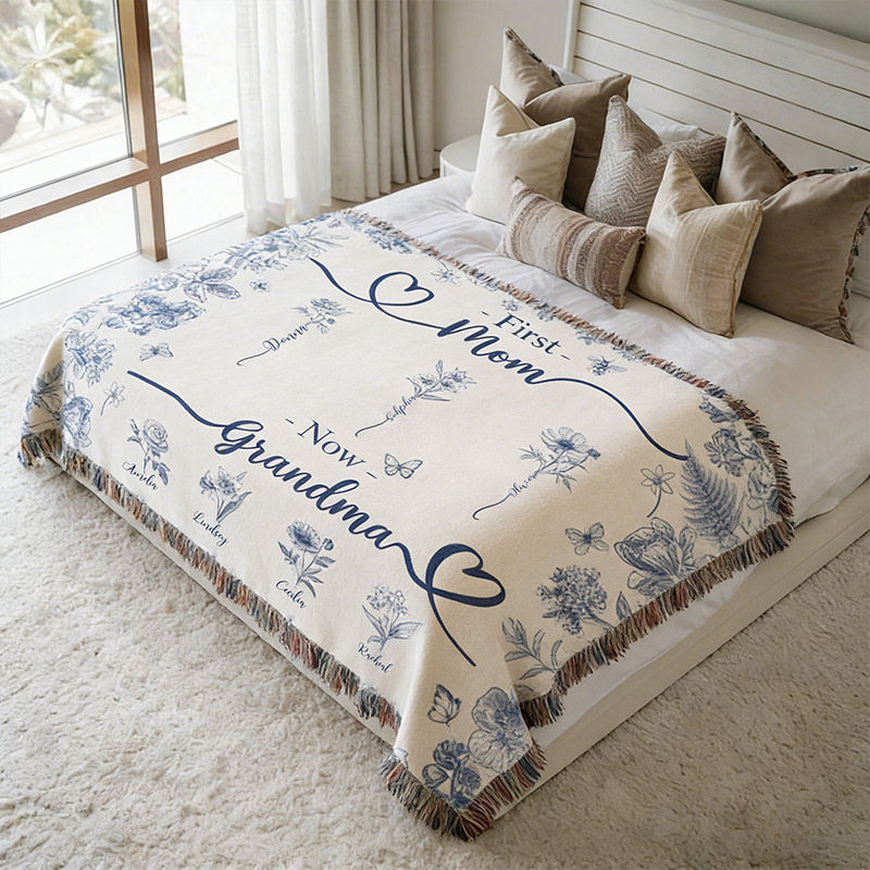 Celebrate your favorite grandma with a cozy, floral woven throw featuring her grandkids’ names. A personalized and timeless gift for any occasion. Perfect birthday or holiday gift for grandma, nana, or gigi!