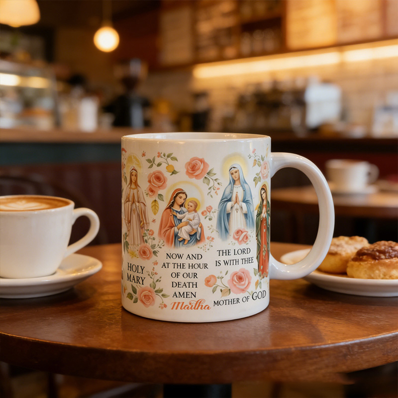 This beautifully crafted mug is a heartfelt tribute to faith and devotion, featuring elegant depictions of the Virgin Mary surrounded by delicate roses. The soft floral design symbolizes purity and grace, while the inclusion of excerpts from the "Hail Mary" prayer—such as "Holy Mary, Mother of God" and "The Lord is with thee"—serves as a constant reminder of spiritual connection and comfort. The serene imagery paired with meaningful scripture makes this mug perfect for moments of reflection, prayer, or simply enjoying a warm drink. It’s an inspiring and thoughtful gift for anyone seeking to keep their faith close in their daily life.